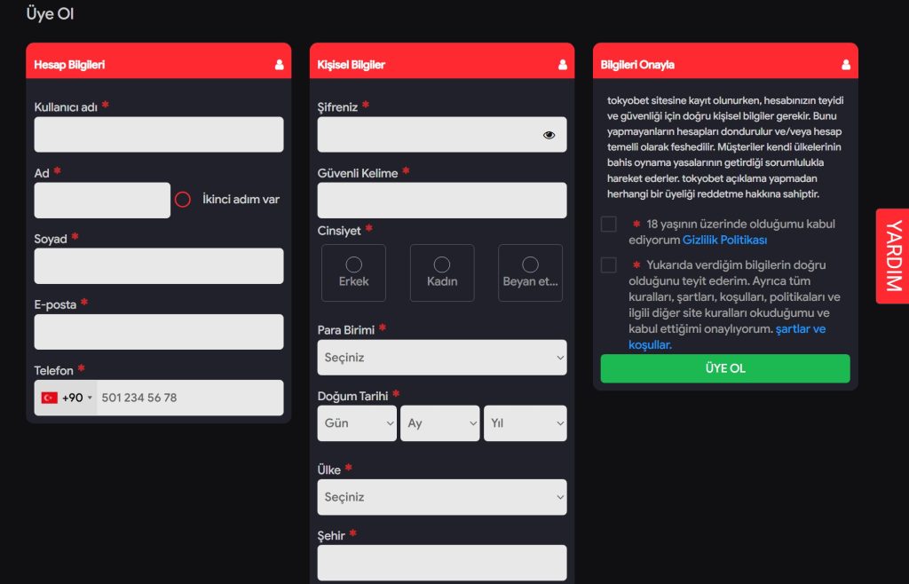 Tokyobet’e üye olmak düşündüğünüzden daha kısa sürecek. 18 yaşından daha büyük yaşında olmanız şarttır. Aynı zamanda Türkiye’de yaşıyor olmanız da şarttır. Tokyobet bahis lisansı yurtdışı menşeili olsa da sitenin hedef kitlesi Türkiye’dir. Bu nedenle gurbetçi olarak nitelendirdiğimiz bireylerden biriyseniz maalesef bu siteye üye olamıyorsunuz.
